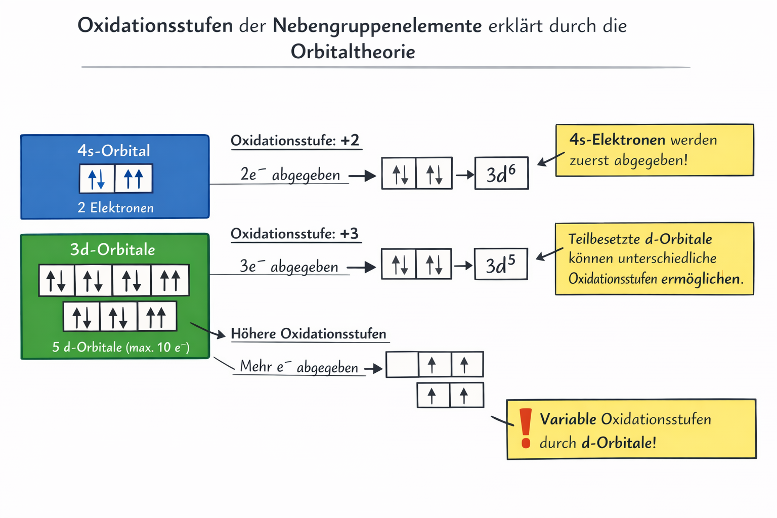 Achte besonders auf den Zusammenhang zwischen s- und d-Orbitalen und der Stabilität von Oxidationsstufen.
